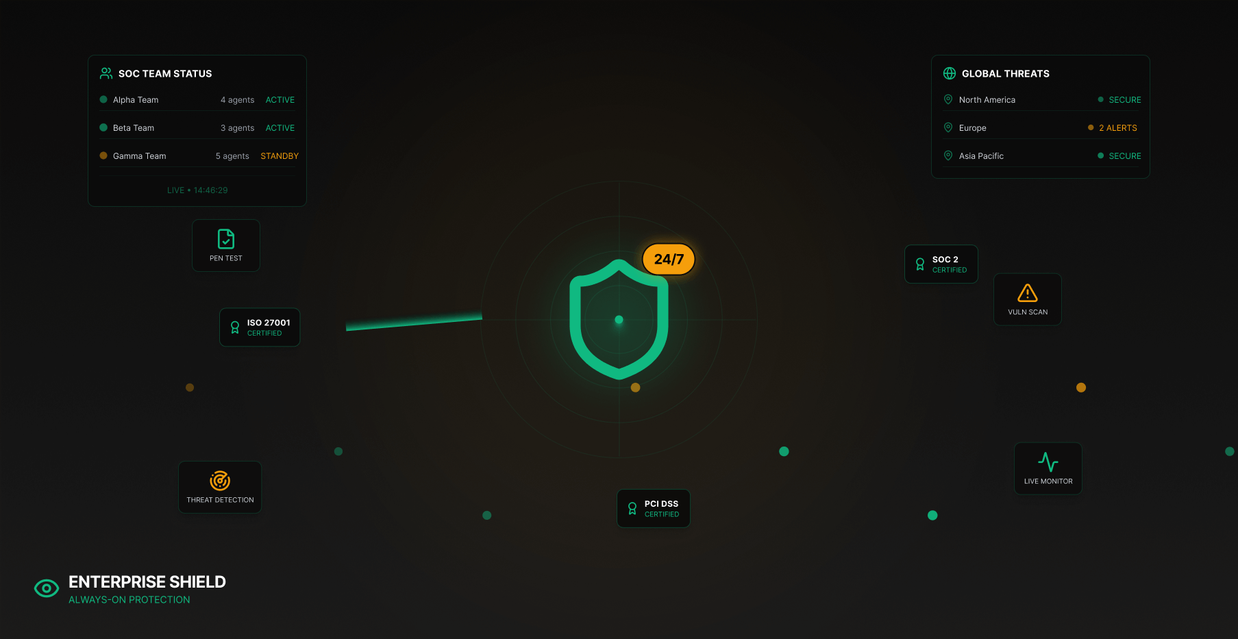 Enterprise Shield provides comprehensive managed security services including continuous monitoring, regular penetration testing, and proactive threat hunting for enterprise clients.