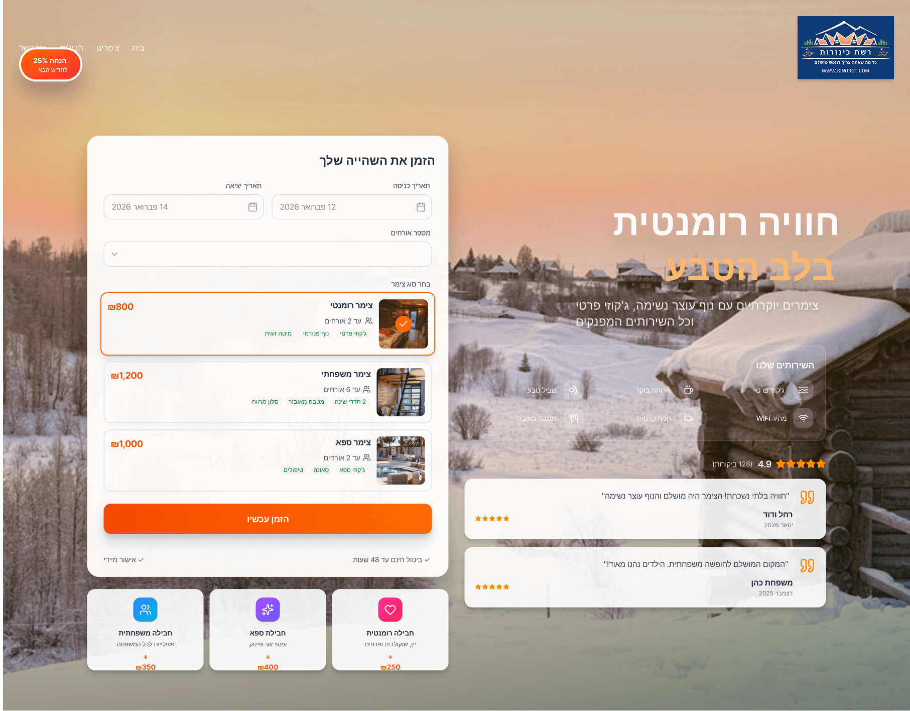 Kinorot needed a digital presence that captured the serene, romantic atmosphere of their resort while providing practical booking functionality. They required a system to manage multiple zimmer units, seasonal pricing, and special packages while reducing dependency on OTAs.